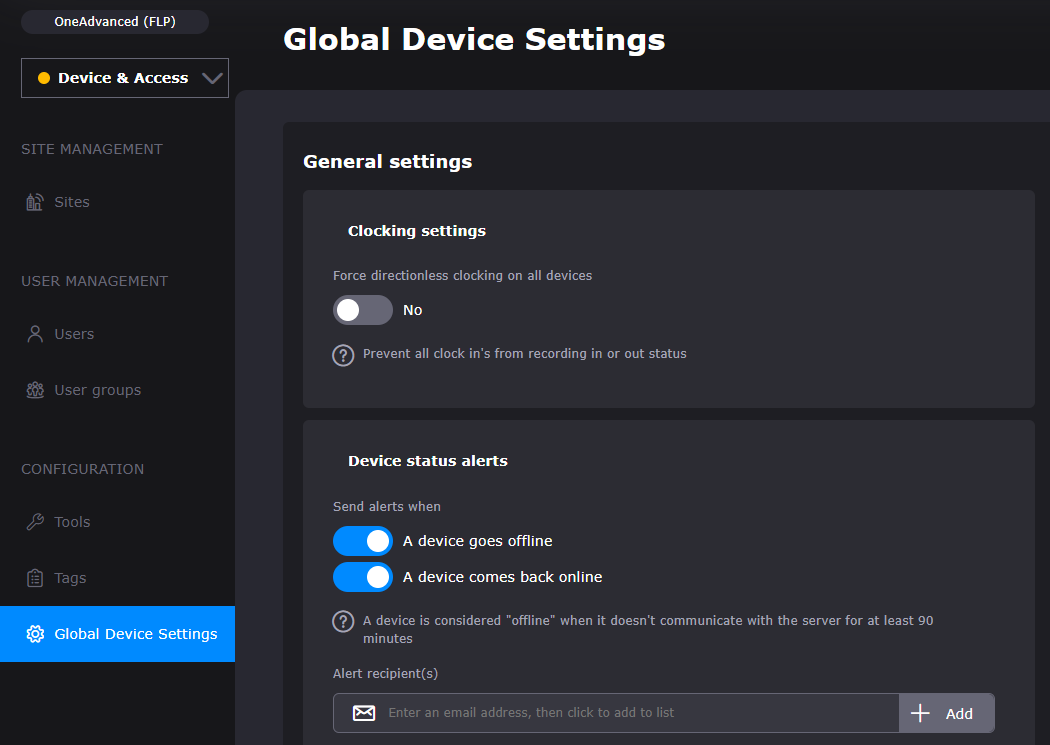 Device Status Alerts is a new feature to the Device and Access Manager. Once configured, it allows customers to configure email notifications to be sent out to a specified group of people alerting them when a terminal device goes offline.