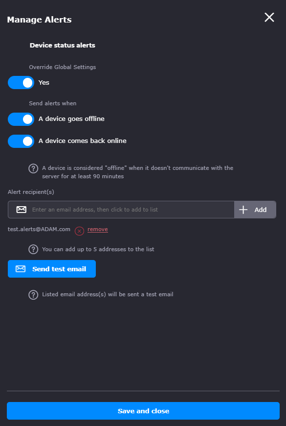 Customers can configure who receives the alert emails by adding (up to 5 email accounts) and removing emails addresses.