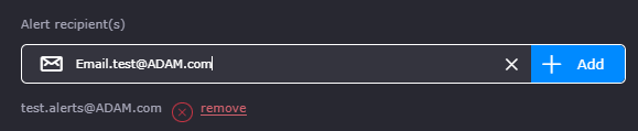 To add an email address enter it in the Alert recipient(s) field and select the add button. If successfully added the email will appear in the list beneath the field.