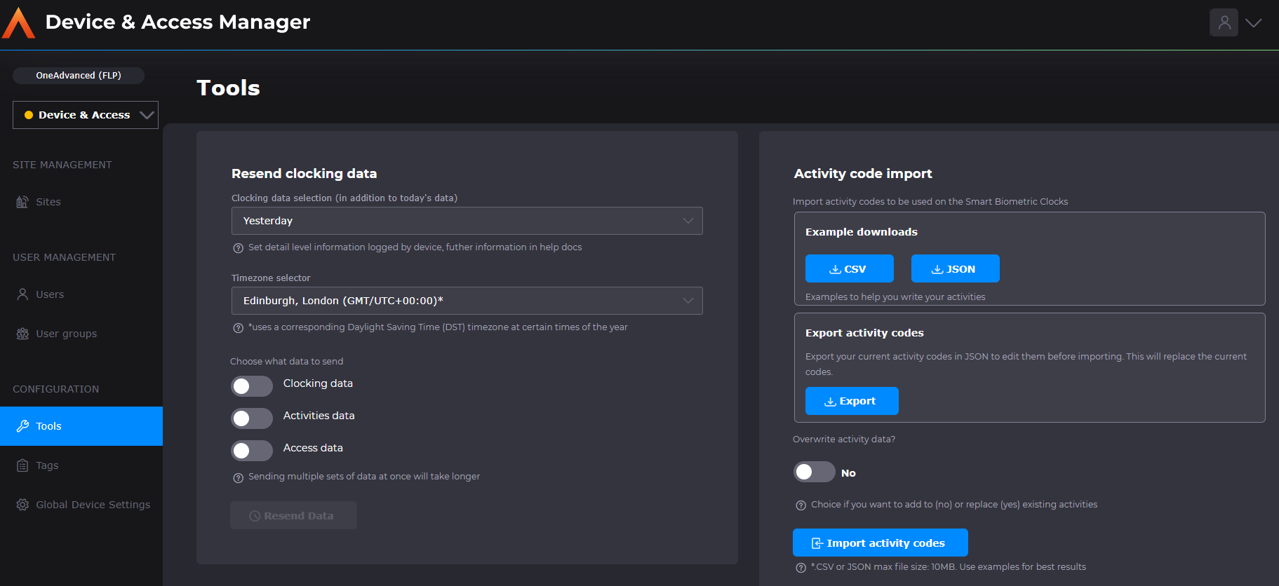 Before an activity can be assigned to the Smart biometric clock (T2), it needs to be imported. To do this open the Tools section via the menu on the left-hand side. The Resend clocking data and Activity code import features are displayed.